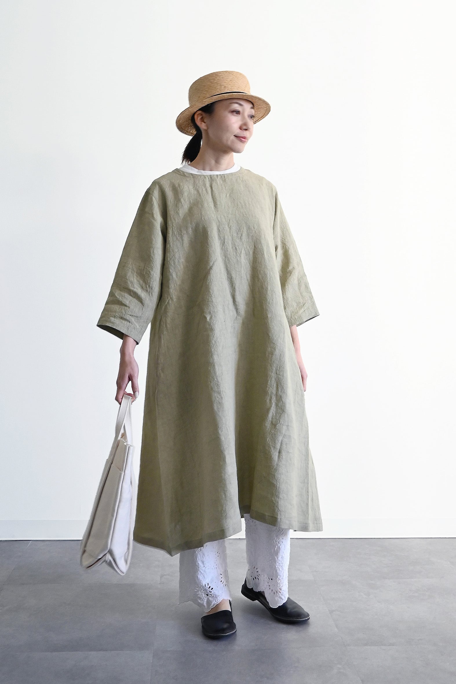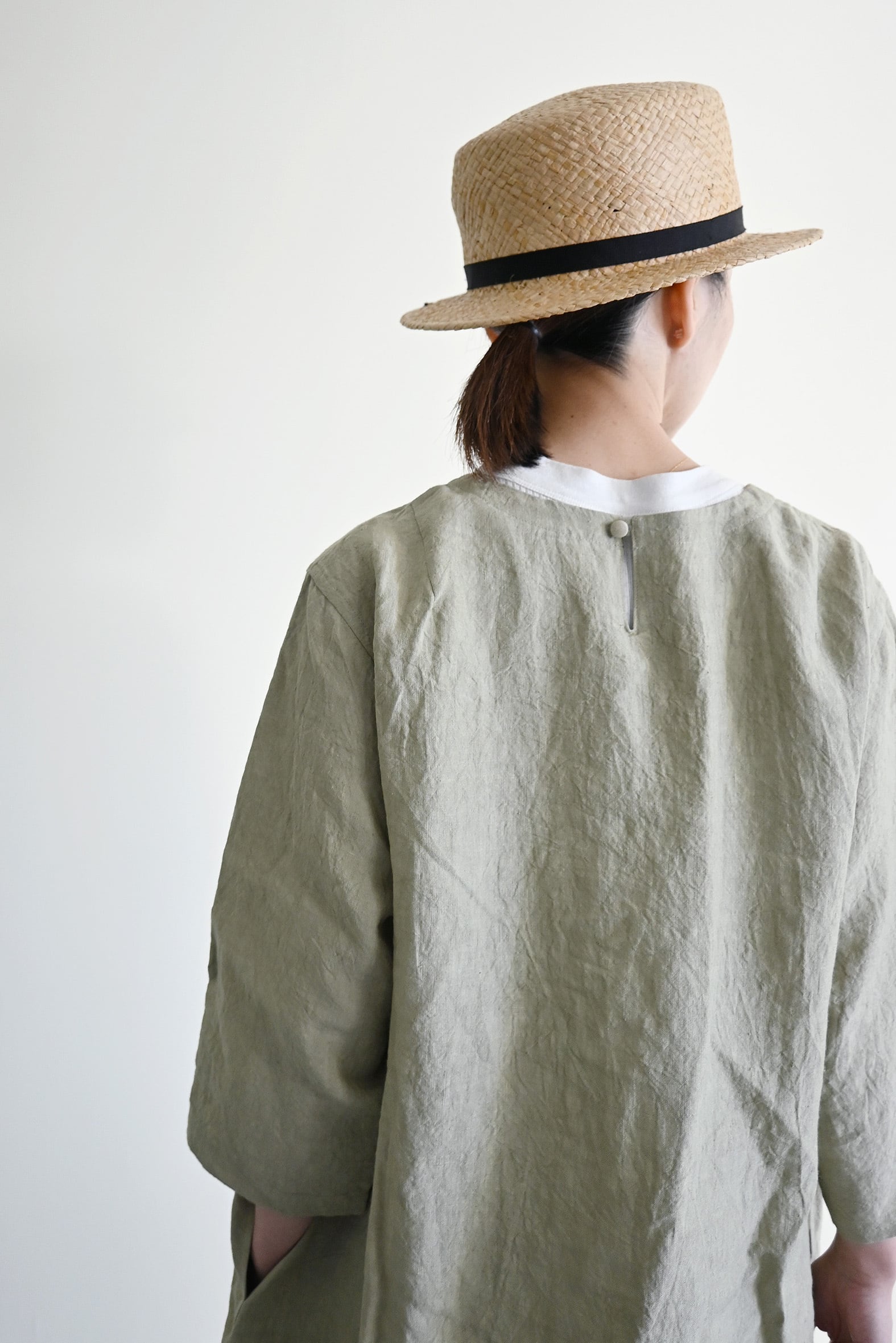 リネン素材の七分袖なので夏はそのまま一枚で着ていただけますし