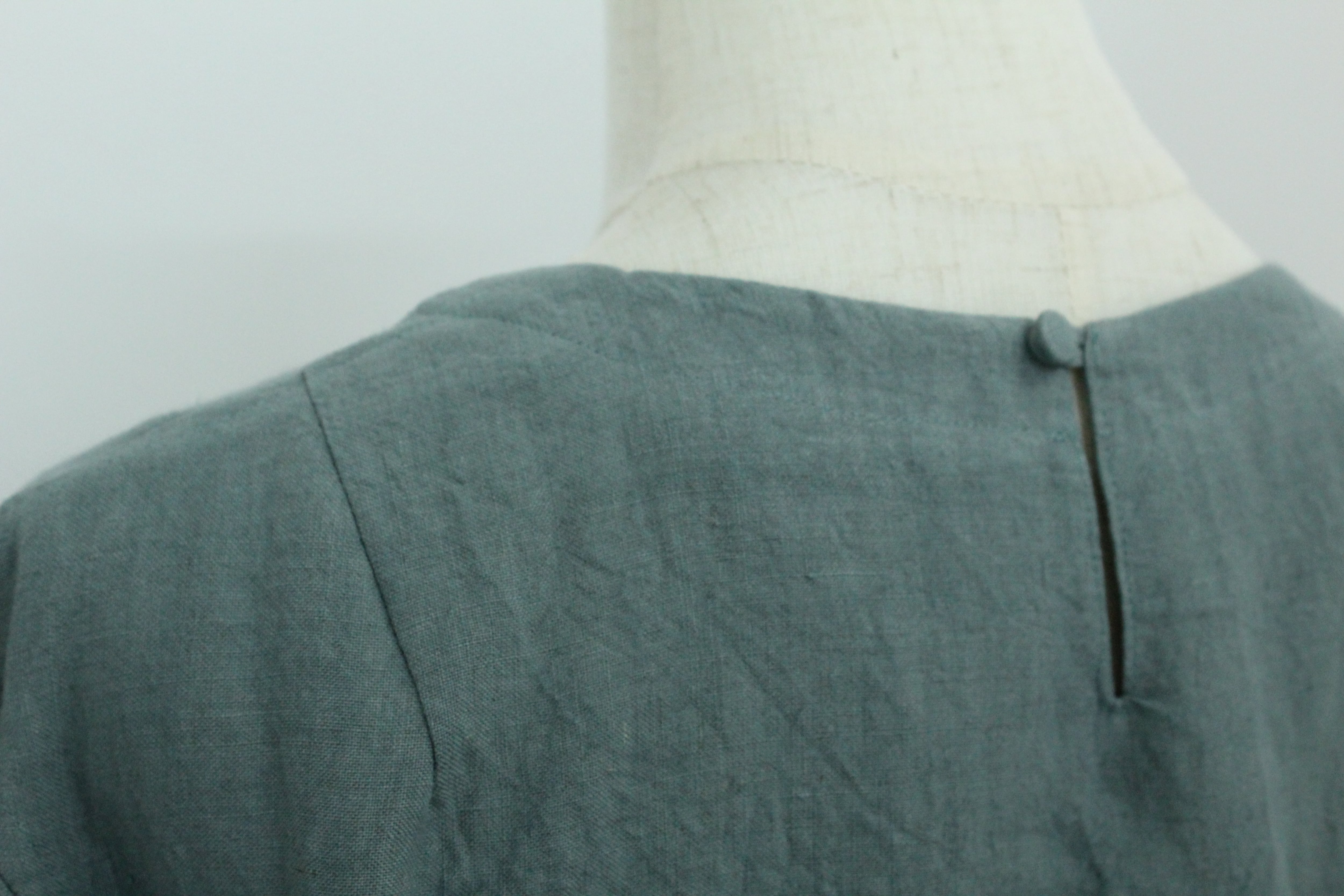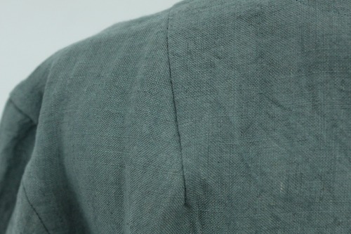 首の後ろは涙開きにくるみボタン、肩にダーツを取っており肩の丸味もカバーできます。